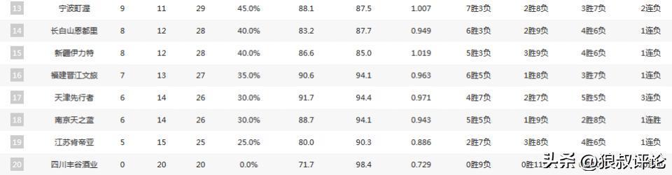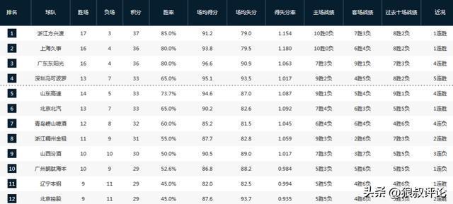 对于积分榜的变化相对比较大,广厦继续捍卫积分榜领头羊,深圳,山东在第一阶段中后期战绩狂飙,中下游球队的战绩非常接近,四川则是遭遇一波20连败。